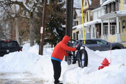 Photo by John Normile/Getty Images A pedestrian lifts his bike over snow…