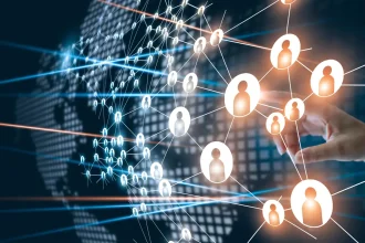 Hand of touching network connecting the human dots icon in business project…