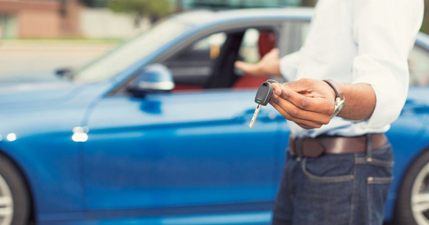 Male hand holding car keys offering new blue car on background