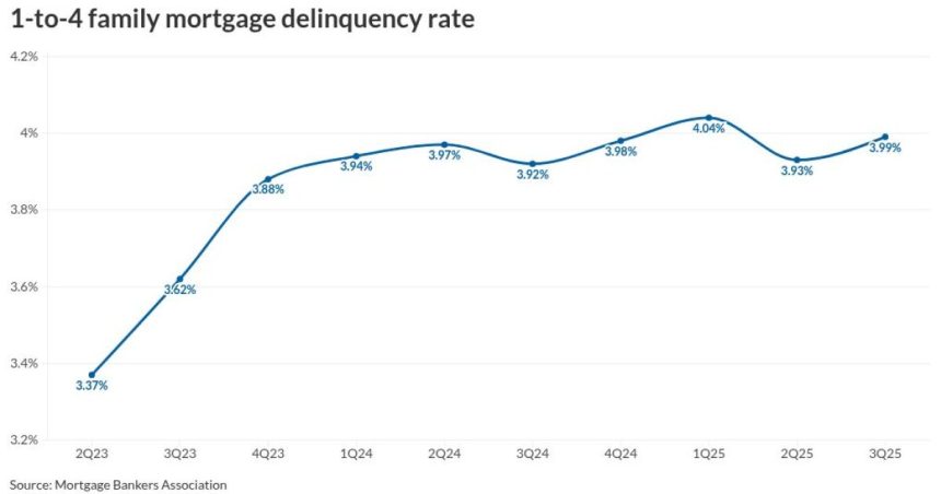 Delinquent mortgages made up 3.99% of all outstanding loans when seasonally adjusted in the third quarter,