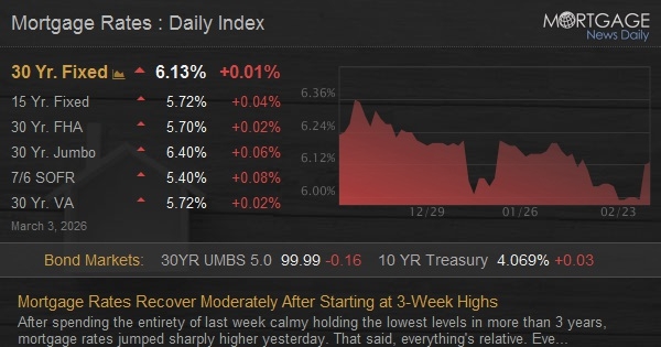 Bonds ended up making it almost all the way back to ‘unchanged,’ thus allowing most lenders to reissue revised rates that were slightly lower than this morning. The average lender didn’t make it quite back to yesterday’s latest levels, but the market movement offered an important proof of concept. Specifically, we’re not necessarily destined to see a runaway rate spike in the coming days.